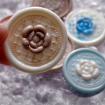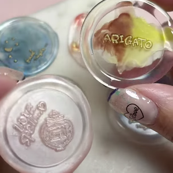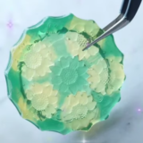 スプーンに残ったワックスと透明グルーを使うことで、おはじきのようなじゅわんとした模様に。ワックスを下に置くか上に被せるかで表情ががらっと変わります。